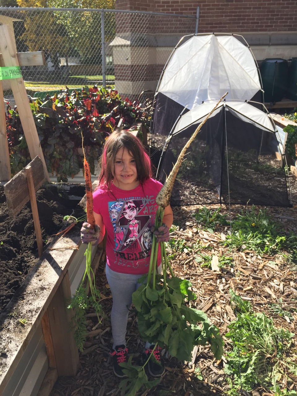 and planting the garden. It is wonderful to see young people interested in growing vegetables and wanting to learn how to garden. Much of our harvest goes to the hot lunch program where we have an amazing chef that makes delicious, healthy, veggie packed meals for our students every day. Again this year we had Phil from Earth Apples bring us a v ariety of seed potatoes for our garden. His product is available at garden centres.I'm not sure what else you would like to know but please feel free to send me any questions that you might have. I have attached some photos. The girl holding the giant carrot and turnip is my daughter Emilia (my family helps me care for the garden in the summer). There is also picture of Phil and his product [only his product showed up]. I will take more photos this week as the garden has really exploded in the last couple of weeks.