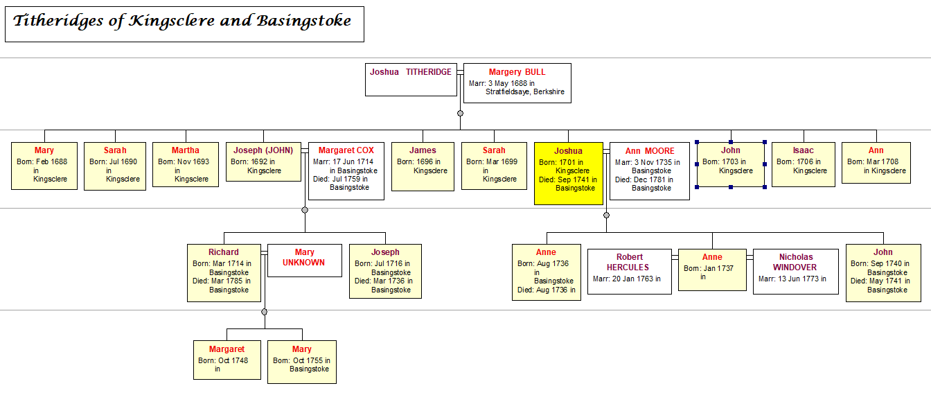 So, who was Joshua? Joshua was baptised on 21 June 1701 one of 10 children born in Kingsclere, Hampshire to Joshua Titheridge and Margaret Butt (sometimes recorded as Bull). The Titheridge surname is also recorded as Titteridge, Tytheridge and Tetheridge. Joshua married Anne Moore on 3 November 1735 in Basingstoke and they had three children Anne who was born and died in 1735, a second daughter called Anne who was born in 1737 and John who was born in September 1740 and died in May 1741 just a few months before Joshua. Joshua was just 40 years old when he died from smallpox; his widow Ann lived another 40 years, her burial being recorded in December 1781 in Basingstoke. After the death of Joshua's nephew, Richard, in Basingstoke in 1785 the Titheridge line in Basingstoke dies out.
